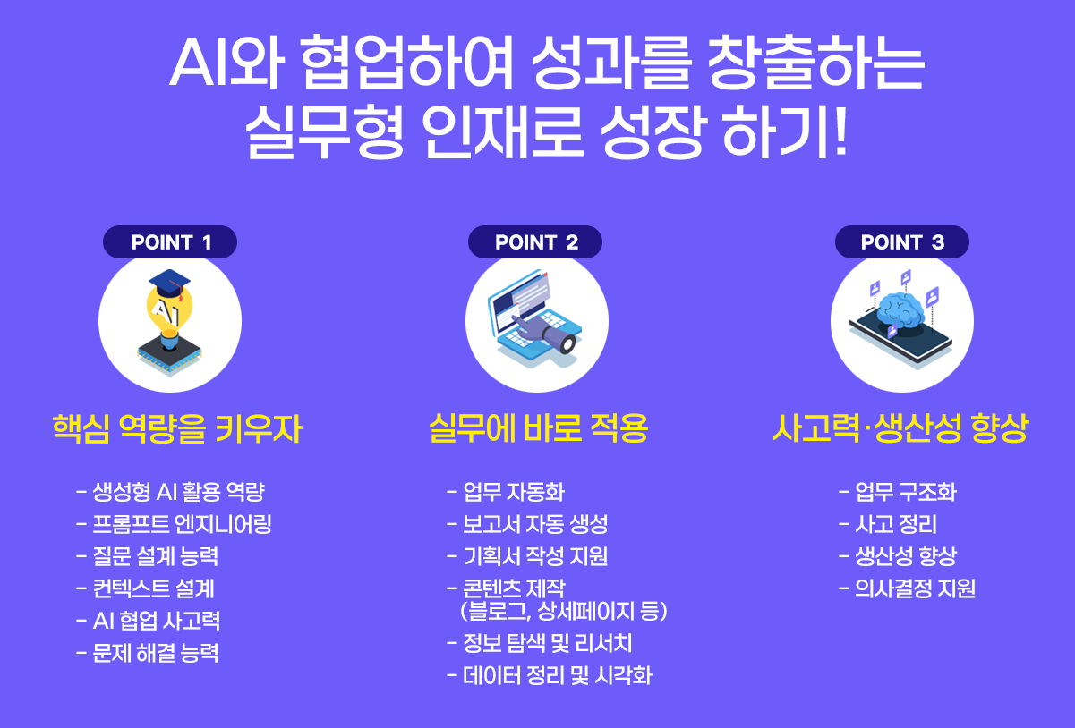 | 사업목적 | 중소기업 근로자들이 AI기초훈련과정을 통해 AI로 변화하는 직무환경에 적응하고 AI를 업무에 활용할 수 있도록 교육 |